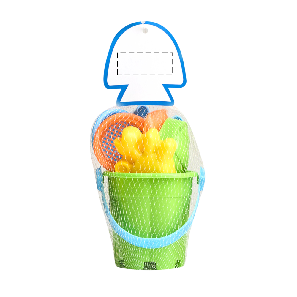 Strand-Spielzeug-Set BEACHLIFE, 7-teilig: bestehend aus kleinem Sandeimer mit Tragegriff, 6 verschiedene Förmchen und Schaufeln – Eimer und Inhalt variieren in Farben und Formen, im Netzbeutel, mit Papier-Fisch für die Werbeanbringung