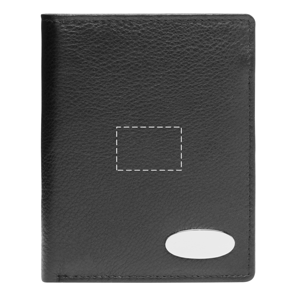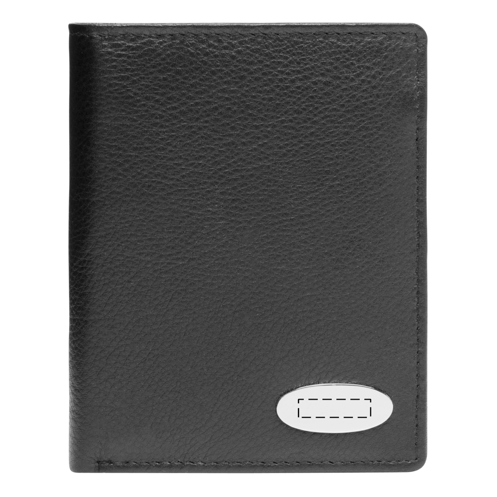 Echtleder-Geldbörse DOW JONES - im Hochformat: innen 6 Einsteckfächer für Geldkarten, 2 Geldscheinfächer, 1 Münzfach mit Druckknopfverschluss für Kleingeld, 1 Netzfach, 4 zusätzliche Fächer, 1 Fach für Einkaufswagen-Chip - außen mit ovaler Metallplatte für eine Werbeanbringung, in Box