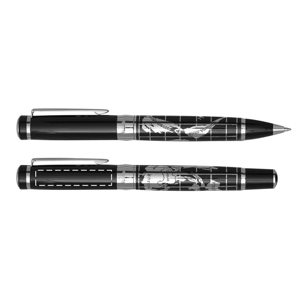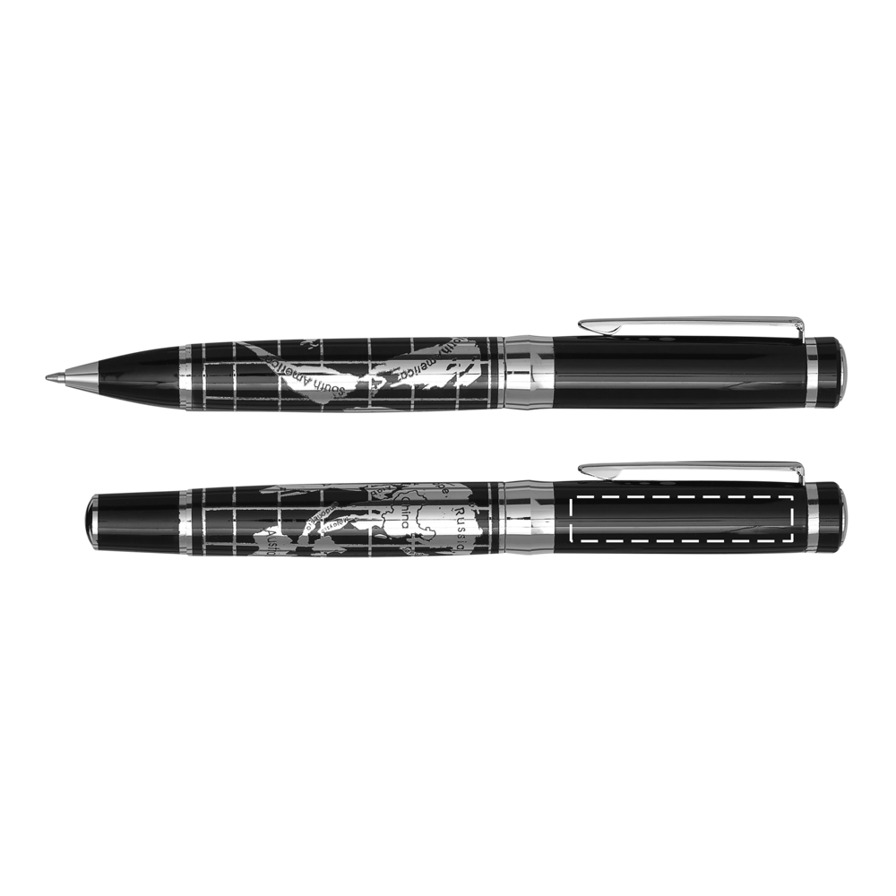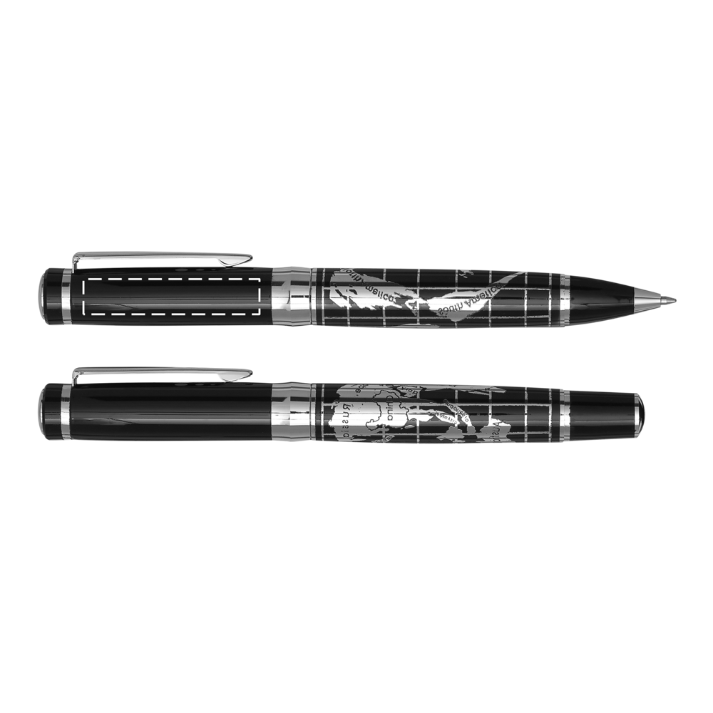 Schreibset INTERCONTINENTAL, 2-teilig: bestehend aus Kugelschreiber mit Drehmechanismus (blauschreibend) sowie Tintenroller mit Verschlusskappe mit Clip (schwarzschreibend), beide Schreibgeräte mit Metall-Schaft und chromglänzendem Weltkarten-Design, im Etui mit Aluminiumplatte