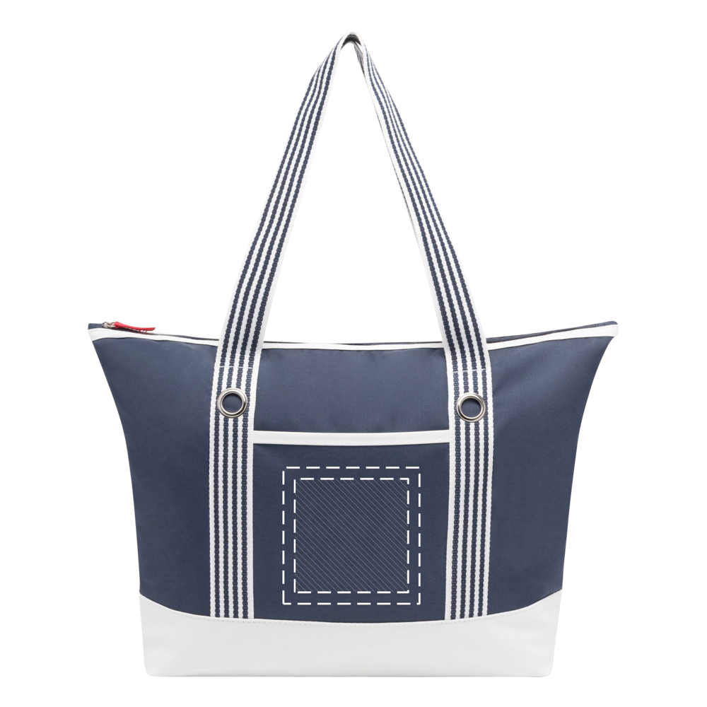 Strandtasche MARLENE: Reißverschluss-Hauptfach, extra Reißverschluss-Tasche innen, Einsteckfach auf der Front, gestreifte Schultergurte mit dekorativer Metallöse, schmutzabweisender Boden